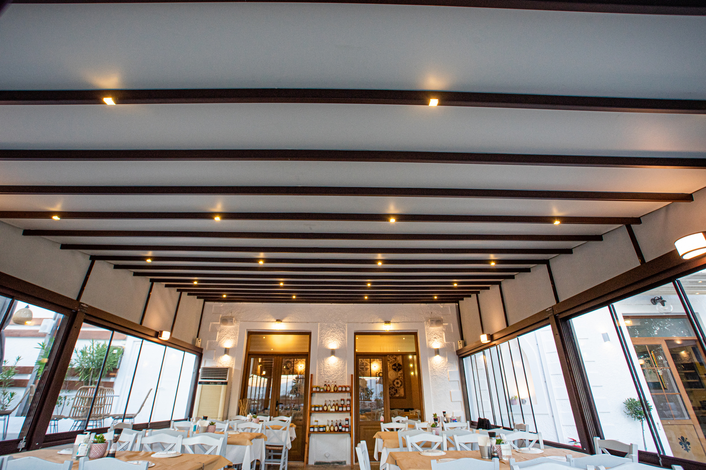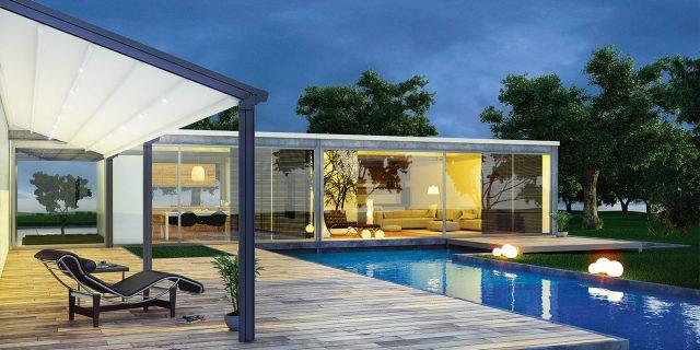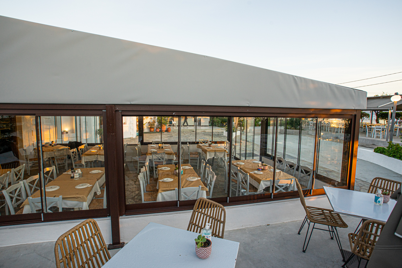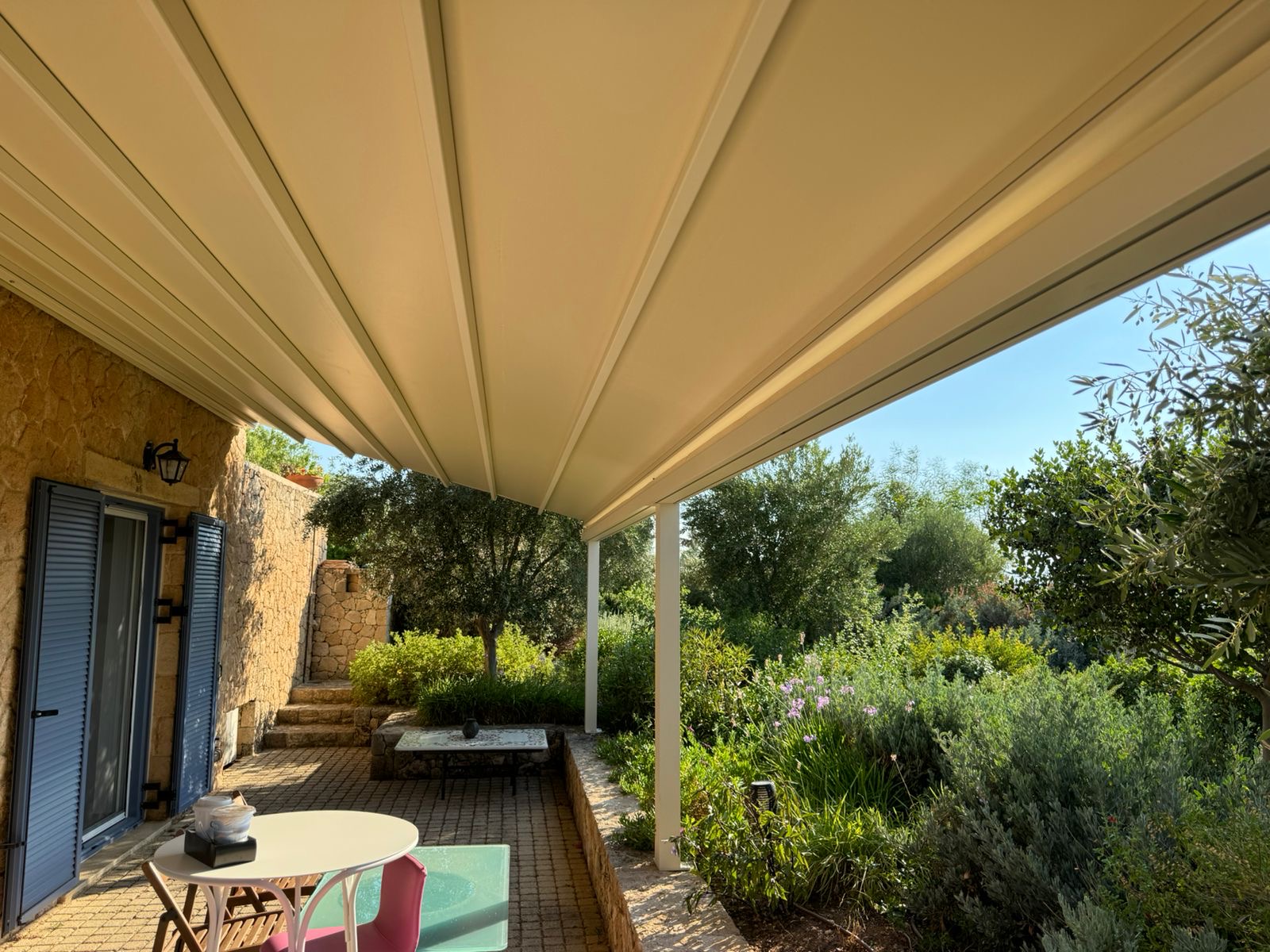 Το ανασυρόμενο σύστημα πέργκολας παρέχει ένα κομψό εξωτερικό κάλυμμα που επιτρέπει τη χρήση εξωτερικών χώρων ακόμα και στις χειρότερες καιρικές συνθήκες. Η μέγιστη διάσταση της είναι 13m X11m.